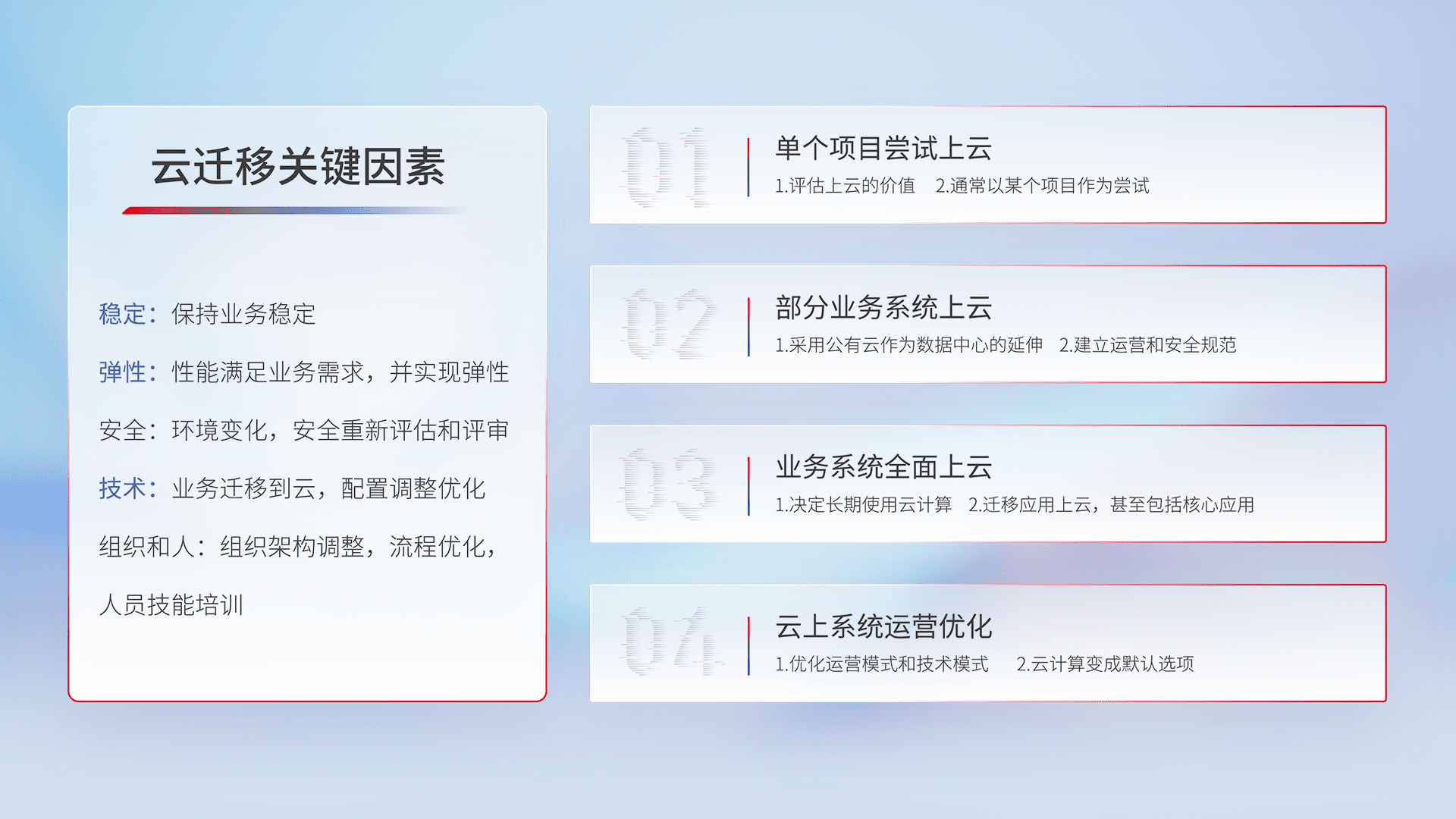 结合实际业务,,,,从规划设计、、、云平台选型、、云原生改造、、、数据迁移、、、、集成交付,,迁移全过程为客户识别最佳上云路径,,,做好风险识别管理,,设计网络架构、、身份权限、、、安全审计合规、、、、操作审计、、、日志审计、、、监控告警策略、、、、多站点容灾设计等,,对云上基础设施进行整体规划,,提升IT治理水平,,,以满足弹性、、、高可用、、、高性能的需求。。