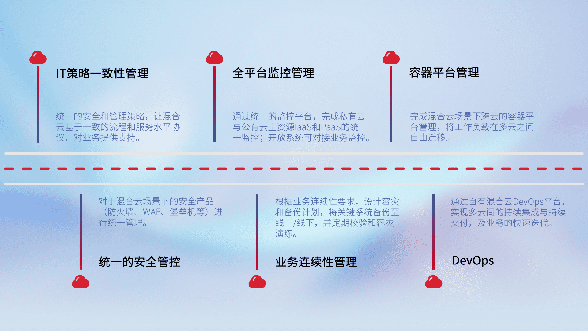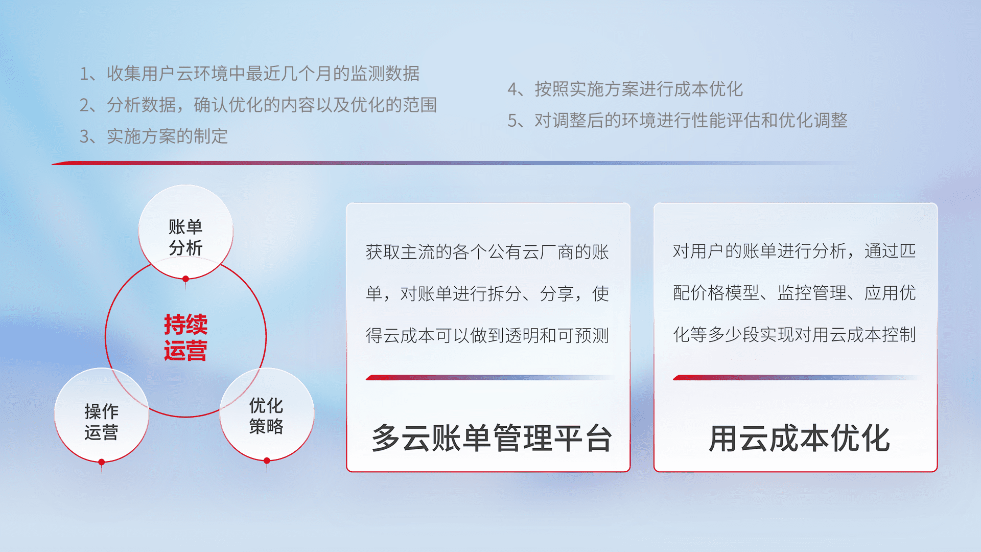 通过多云纳管,,,,以统一的资源数据模型把客户的云资源进行抽象和封装,,,进而实现对多云资源的统一操作,,保障云资源管理的可靠性、、、稳定性与可用性。。。量身定制化运维内容,,,,配置、、、、开发运维、、、、补丁管理、、、备份、、、监控、、认证和访问管理、、、审计和日常巡检等,,保障在用云过程中的可靠度,,稳定度以及高可用率。。