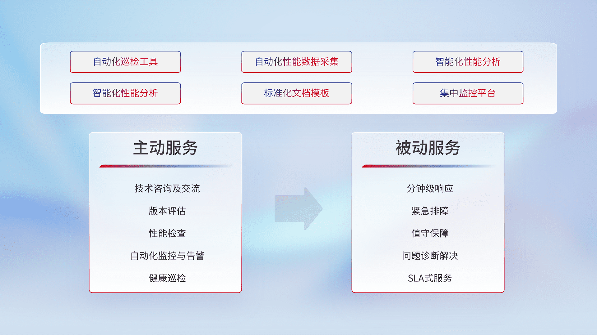 智能化工具和标准化文档,,,,保障服务质量,,,提供主动服务(包含技术咨询、、版本评估、、、性能检查、、自动化监控与告警、、健康巡检)和被动服务包含(分钟级响应、、紧急排障、、、、值守保障、、、问题诊断解决、、SLA服务)。。
